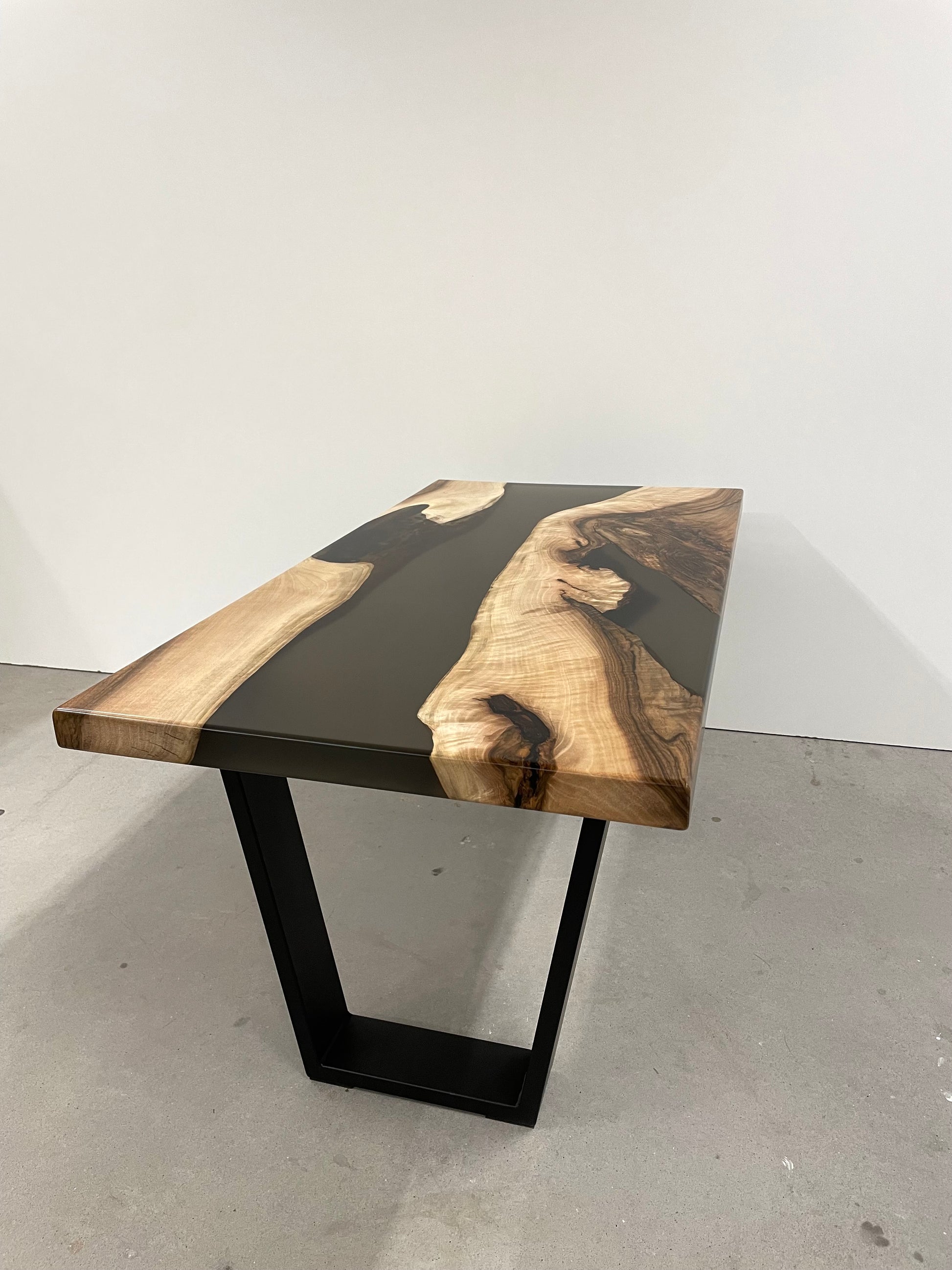 Der Tisch wurde fein geschliffen, anschließend lackiert und zusätzlich für einen besseren Schutz mit einer Keramikbeschichtung eingerieben. Die Oberfläche des Epoxidharzes ist matt. Das Gestell besteht aus hochwertigem Metall, das schwarz lackiert wurde.