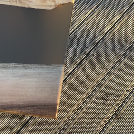 Die Tischplatte ist zusätzlich mit einer robusten, pflegeleichten Lackierung versehen, die das Holz schützt und die Maserung betont. Für noch mehr Widerstandsfähigkeit und Langlebigkeit sorgt der eingearbeitete Keramikschutz, der Kratzern und Abnutzung effektiv vorbeugt, ohne die natürliche Schönheit des Holzes oder die Klarheit des Harzes zu beeinträchtigen.