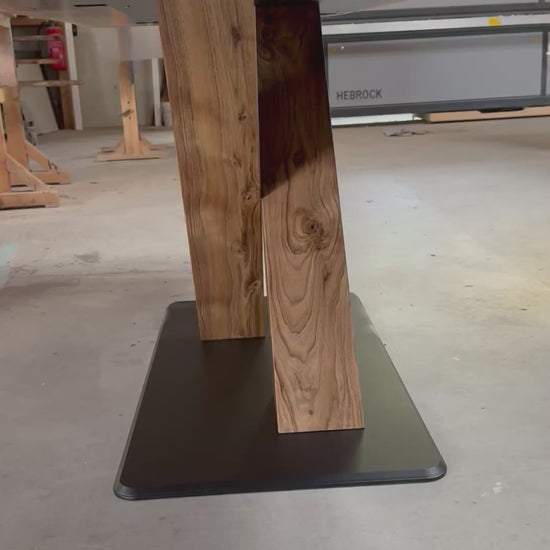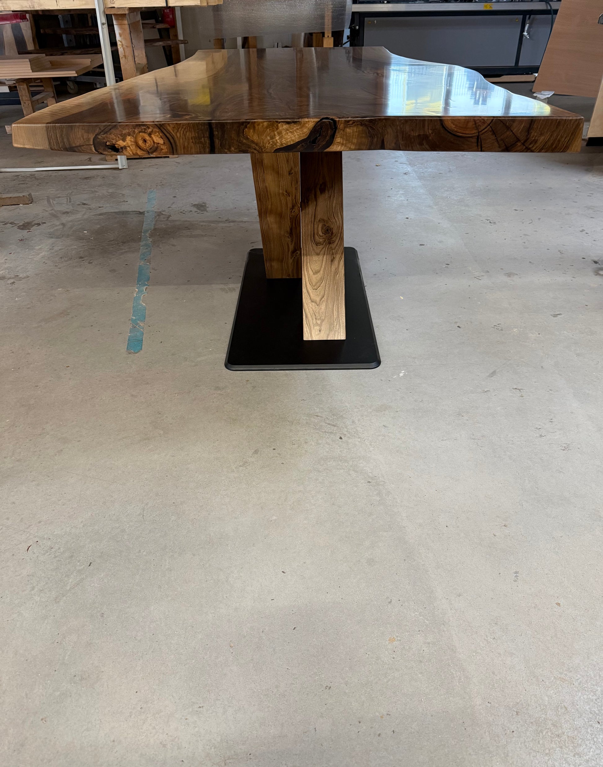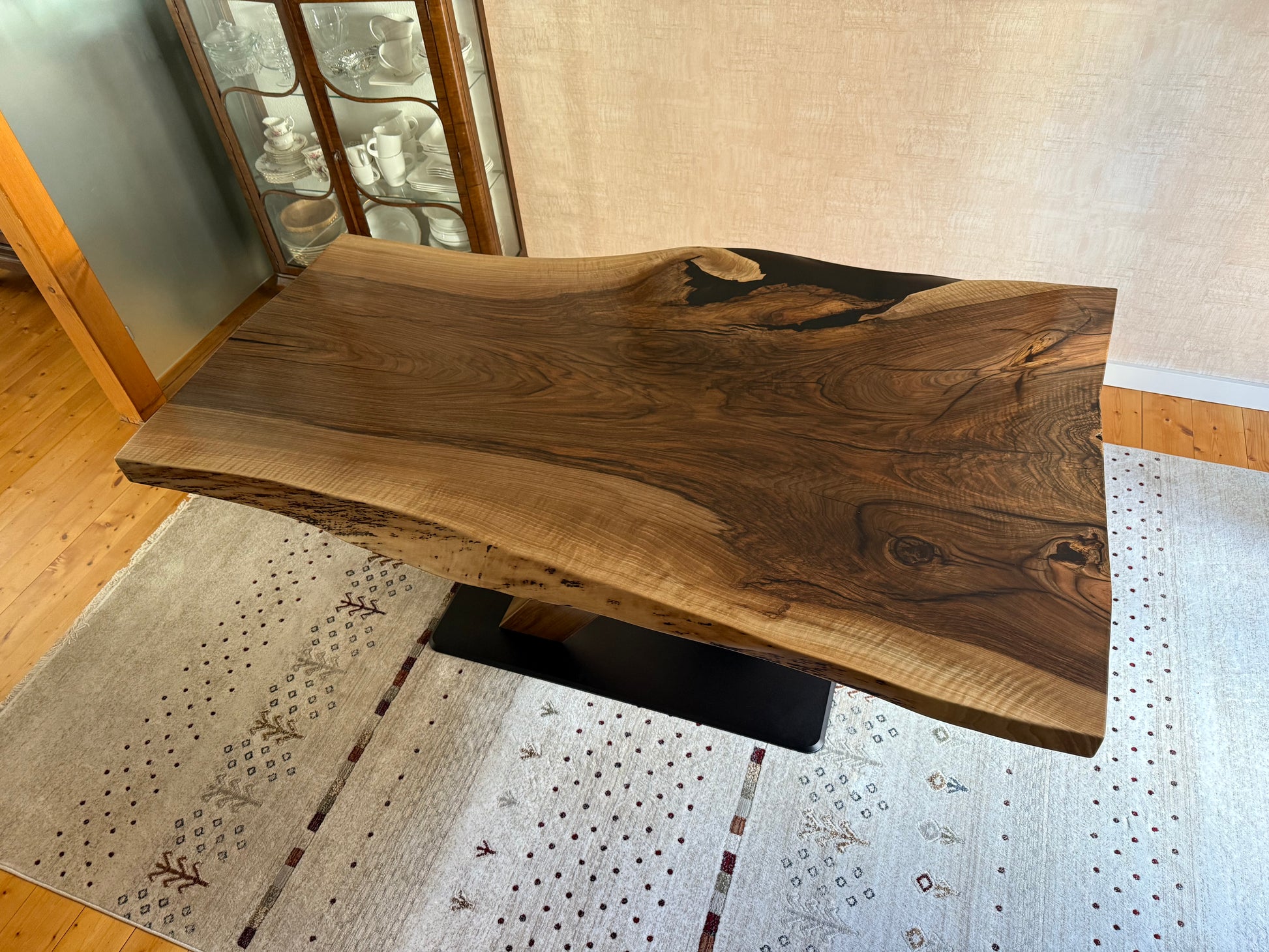 Einzigartige Nussbaumplatte kombiniert mit Tischgestell Nussbaum X Metall