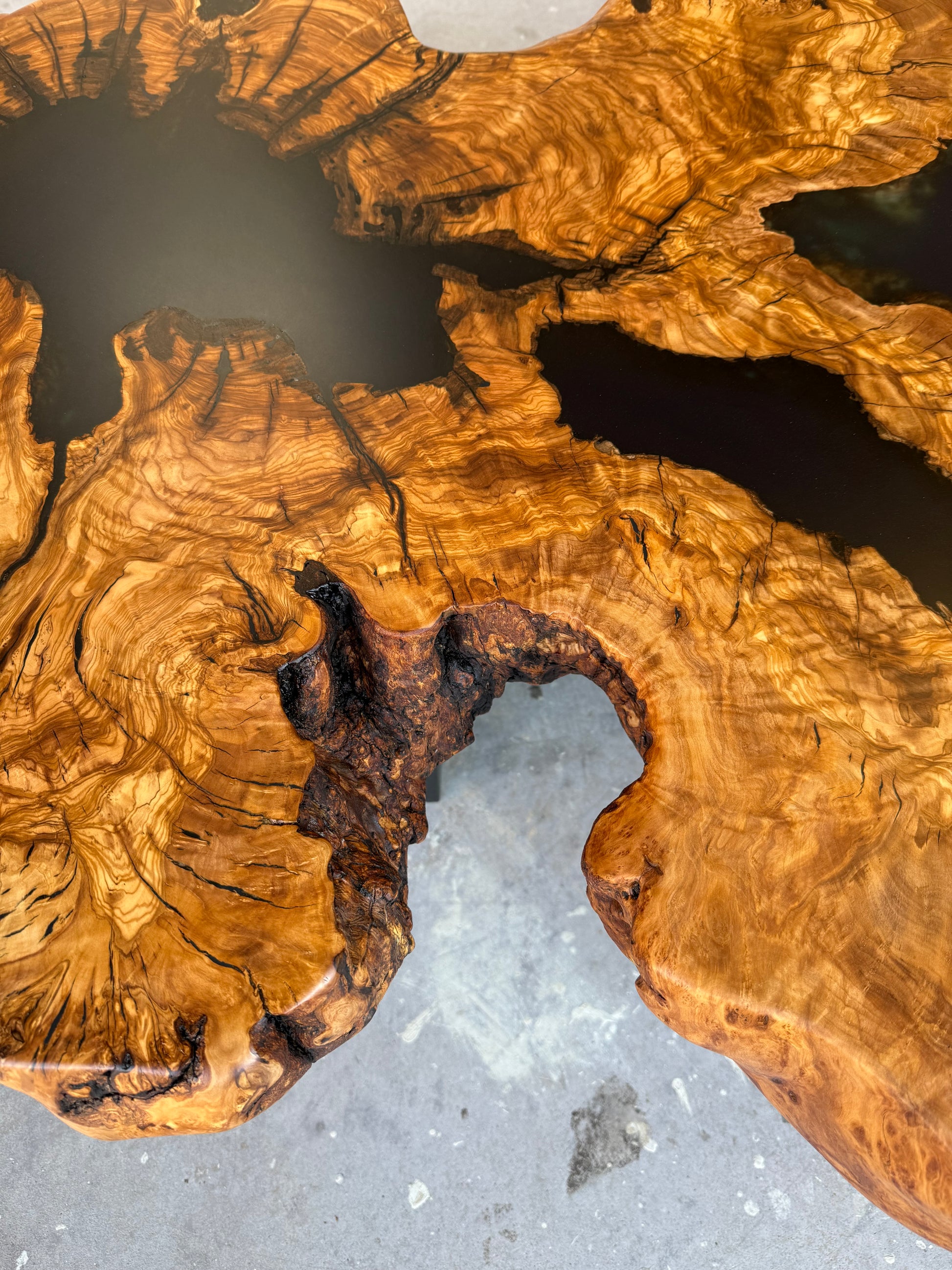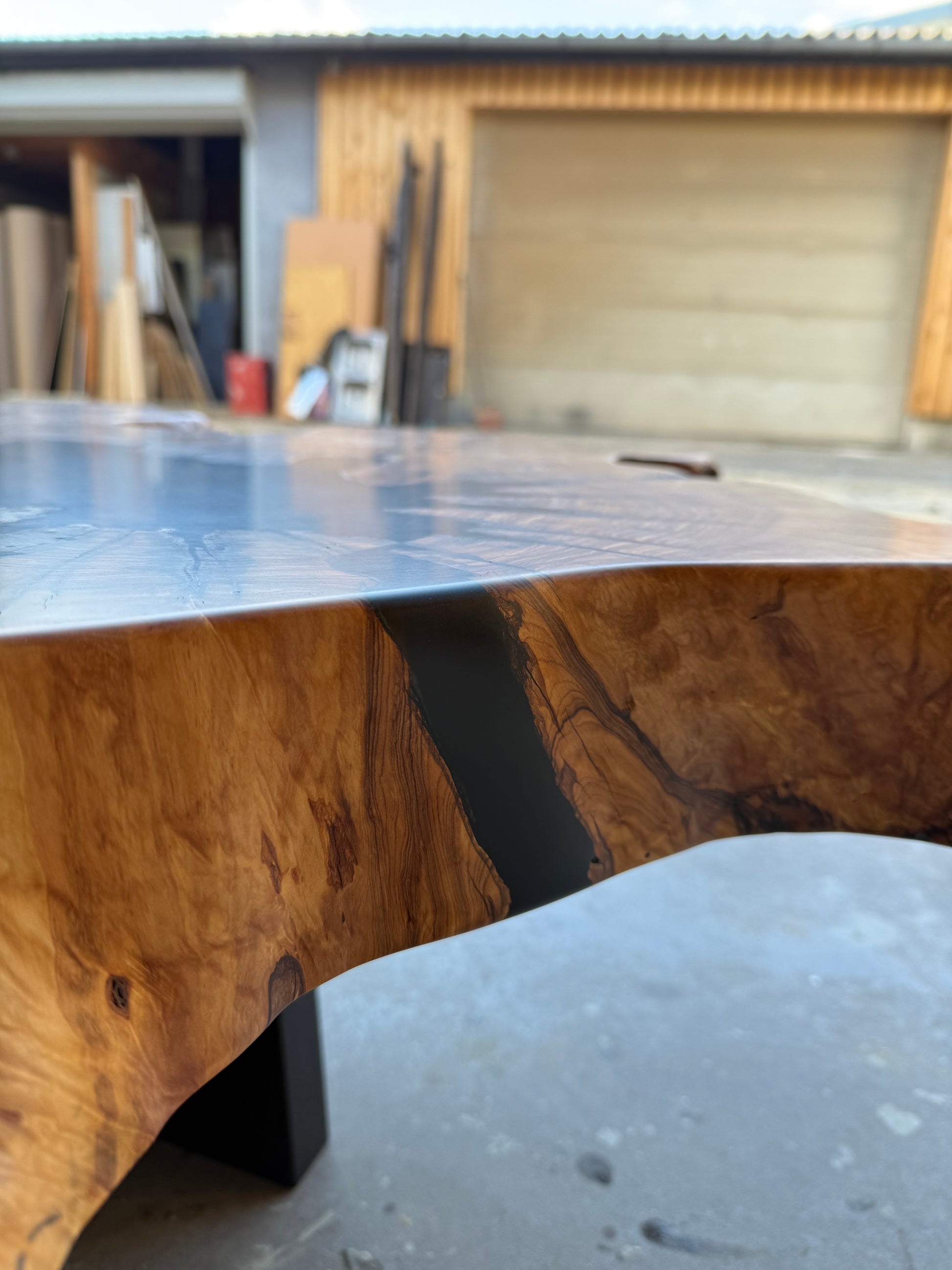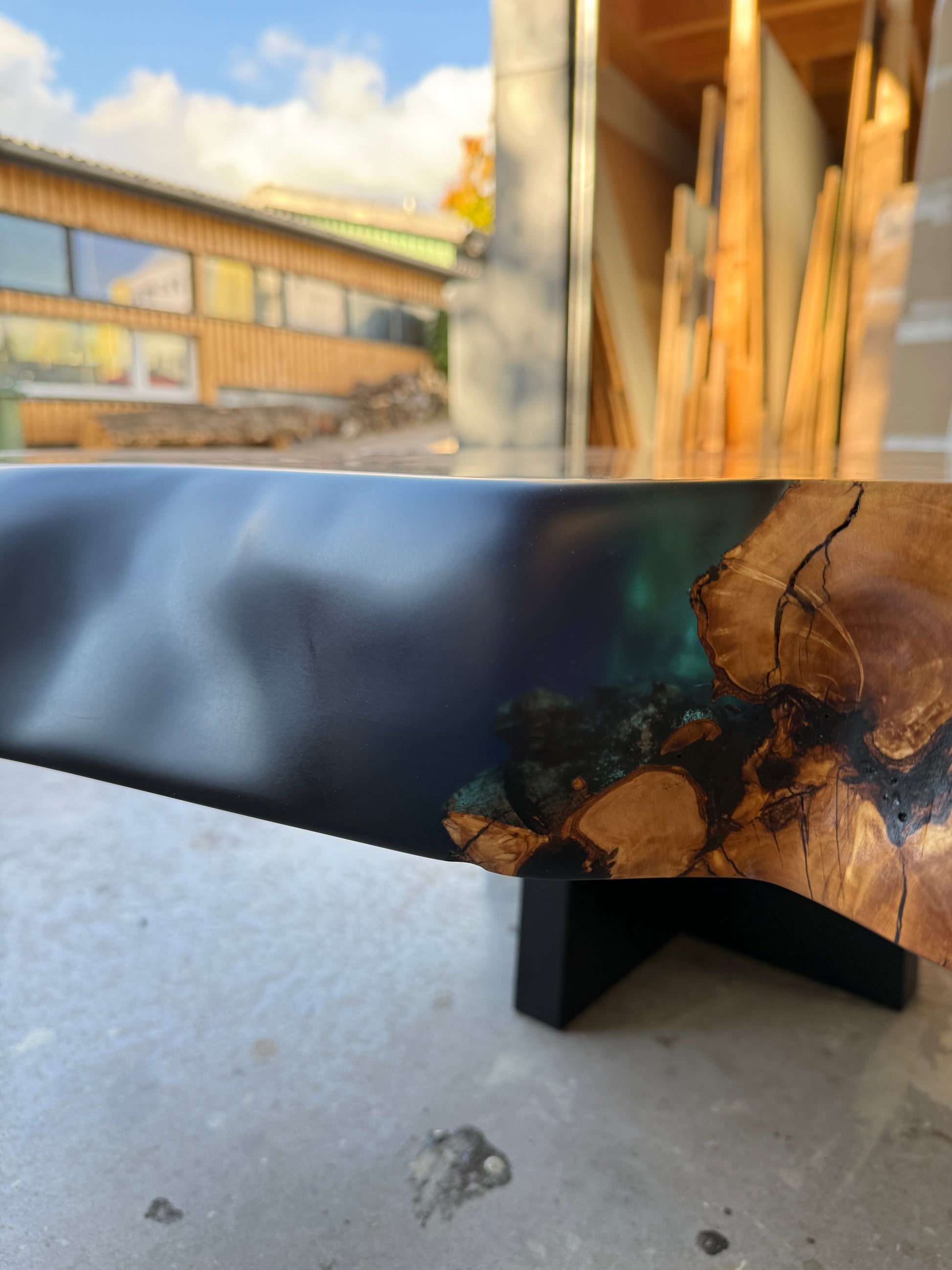 Exklusiver Olivenholztisch mit beeindruckender, einzigartiger Maserung, kunstvoll kombiniert mit Epoxidharz. Die außergewöhnliche Tischplattenstärke von 10 cm verleiht dem Stück eine markante Präsenz und unterstreicht seinen Unikat-Charakter – ein außergewöhnliches Highlight für jeden Raum.